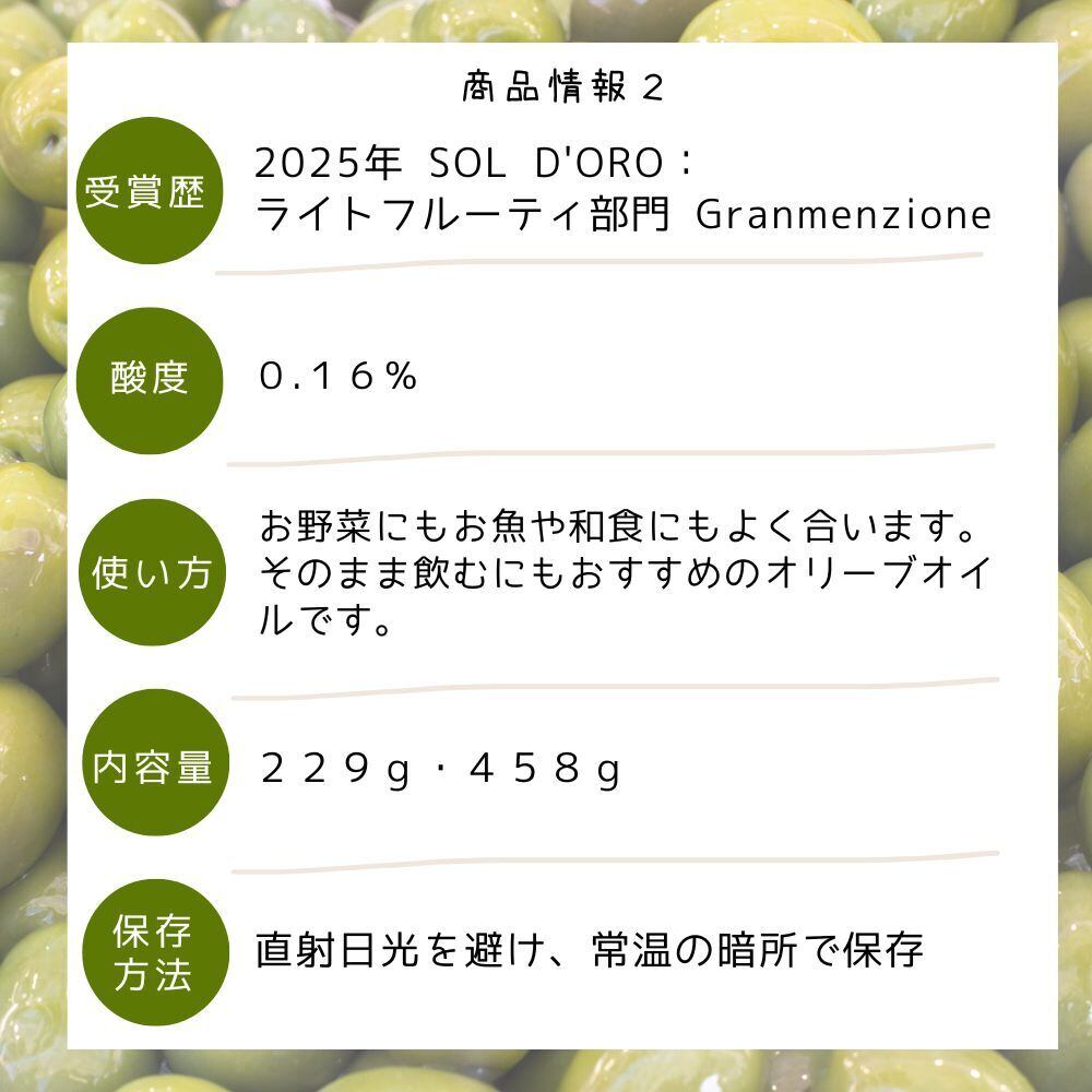 イタリア・リグーリア州のオリーブ品種であるタジャスカ種はマイルドでフルーティーな香味が特徴です。こちらはまだ未完熟の青いオリーブを搾油しているため、タジャスカ種特有の甘い芳しい香味を残しながら、他のタジャスカ種にはあまり見られない草の香りがあります。雑味、油っぽさを感じさせないので飲むオリーブオイルにも向いています。