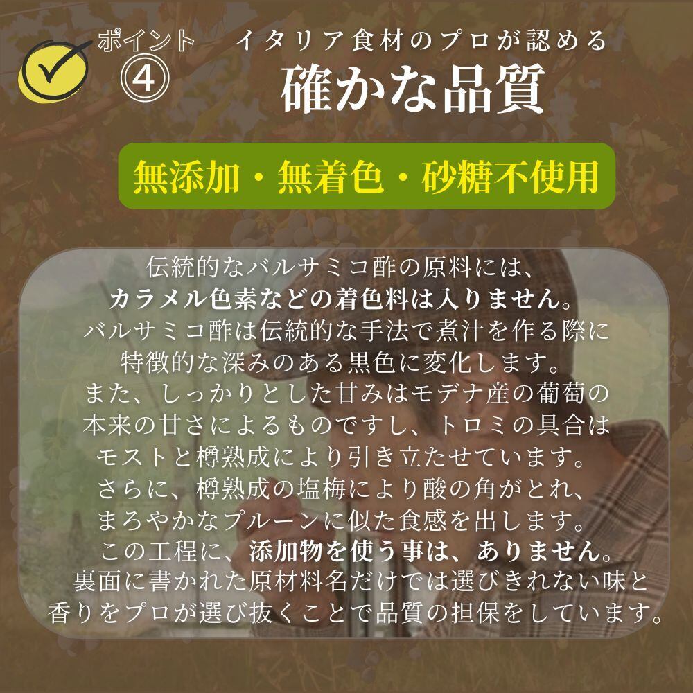 野菜サラダを始めとして、多くの食材に合わせやすいバルサミコ酢です。3年間の樽熟成による重厚な香りが、オーク樽の重厚な香りを匂わせます。このバルサミコ酢は香りの強さに併せて、かどの取れた酸味が伴う、汎用性の高いタイプになります。